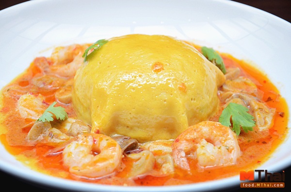 ข้าวไข่ข้นซอสต้มยำกุ้ง (109.-) เป็นเมนูเด็ดของร้าน นอกจากทำได้สวยงามแล้ว ยังอร่อยด้วย ที่เห็นกลมๆ นั้น คือข้าวที่โปะด้วยไข่และราดด้วยซอสต้มยำกุ้ง จานเดียวอยู่