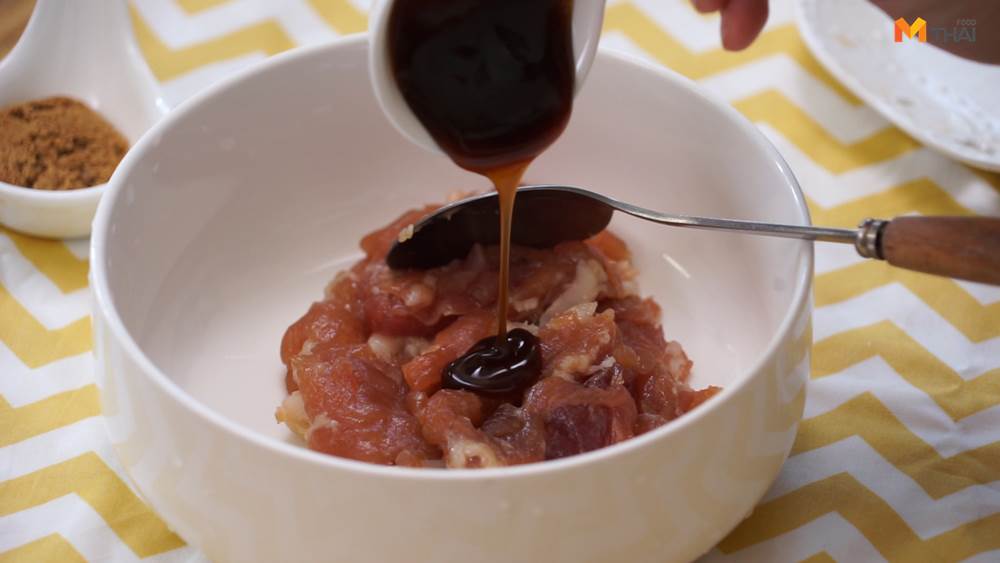 1. ใส่เครื่องปรุงในหมู หมักหมูทิ้งไว้ 1 ชั่วโมง