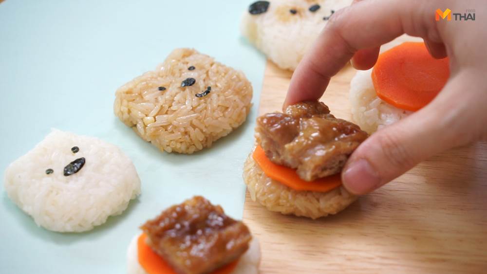 เปลี่ยนข้าวเหนียวหมูปิ้งมาเป็นเมนูที่น่าตื่นเต้นมากยิ่งขึ้น เบอร์เกอร์หมูปิ้งพี่หมี นำข้าวเหนียวมาทำเป็นเบอร์เกอร์แล้วนำหมูปิ้งมาเป็นไส้ด้านใน ตกแต่งให่น่ารักอย่างเช่นรูปหน้าหมี แค่นี้เด็กๆ ก็ชอบแล้วค่ะ