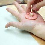 2. ปั้นแป้งเป็นวงกลมโดยใส่เผือกไว้ด้านใน
