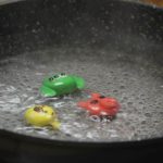 4. ตั้งน้ำให้เดือด จากนั้นลดไฟอ่อนนำแป้งลงลวกจนสุก เมื้อสุกแล้วตัวแป้งจะลอยขึ้นตักพักในน้ำเย็น