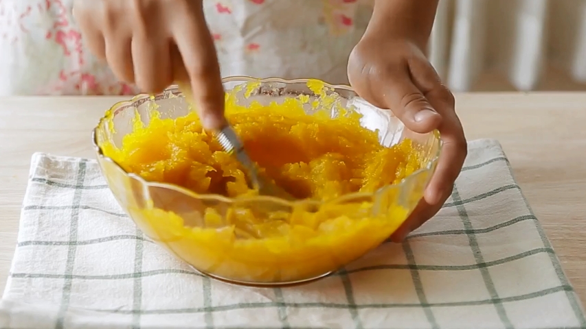 1. ตั้งหม้อลังถึง ใส่น้ำ 3/4 ของหม้อ ปิดฝา ยกขึ้นตั้งบนไฟแรง นำฟักทองไปนึ่งจนสุก บดด้วยส้อมหรือใช้เครื่องผสมอาหาร ให้ละเอียด พักไว้