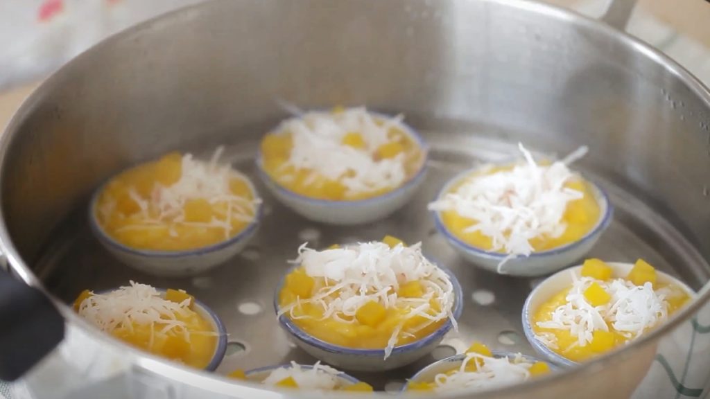 5. ตักใส่ถ้วยตะไล โรยหน้าขนมด้วยมะพร้าวทึนทึก นำไปนึ่งประมาณ 20 นาทีหรือจนสุก ปิดไฟ ยกลงเสิร์ฟ