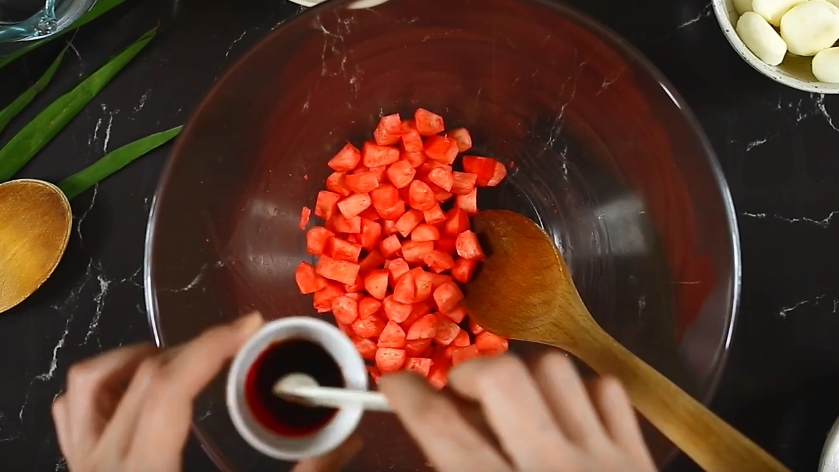 1. หั่นแห้วที่ซื้อมาเป็นลูกเล็กๆ ใส่ชาม จากนั้นใส่สีแดงลงไปผสม เวลาใส่สีให้ใส่ครั้งละน้อยๆ แล้วค่อยๆ เพิ่ม ถ้าใส่เยอะไป สีจะเข้มไป