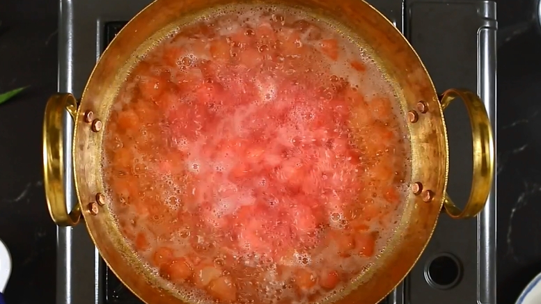 ต้มกะทิกับใบเตย เกลือ และน้ำตาล เมื่อเข้ากันดีแล้ว ตักใบเตยออก จากนั้นใส่เนื้อมะพร้าวอ่อนลงไป ต้มต่อสักครู่ ต้องคนบ่อยๆ อย่าให้เดือด ต้มเสร้จแล้วพักไว้ สำหรับราดด้านหน้าขนมทับทิมกรอบ
