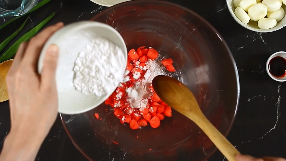 2. คลุกสีให้เข้ากันกับแห้ว ค่อยๆ ใส่แป้งมันลงไปคลุกกับแห้ว คลุกให้ทั่ว อย่าให้หนามาก เพราะแป้งจะเยอะและไม่สวย