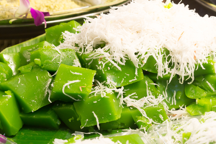 - เทขนมใส่ถาด รอจนขนมเย็นแล้วตัดแบ่งเป็นชิ้น เสิร์ฟพร้อมมะพร้าวขูดคลุกเกลือโรยหน้า