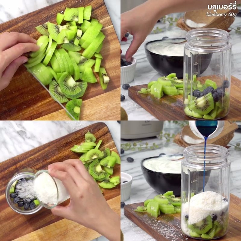 1. หั่นกีวีใส่โถปั่น ตามด้วยบลูเบอร์รี่ เกล็ดมะพร้าวและไซรัปบลูฮาวาย