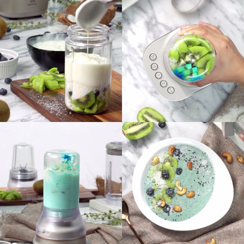 อาหารสุขภาพเริ่มต้นได้ด้วยเมนูสีน่ารักๆ บลูโยเกิร์ตสมูทตี้โบว์ล รสชาติอร่อยด้วยผลไม้รสเปรี้ยว สีสันสดใสอย่างกีวีและบลูเบอร์รี่ ปั่นรวมกันโดยไม่ต้องปรุงรสใดๆ ความหวานและเปรี้ยวจะออกมาเอง เสร็จแล้วก็ตกแต่งจานให้สวย เชิญชวนให้กินสุดๆ