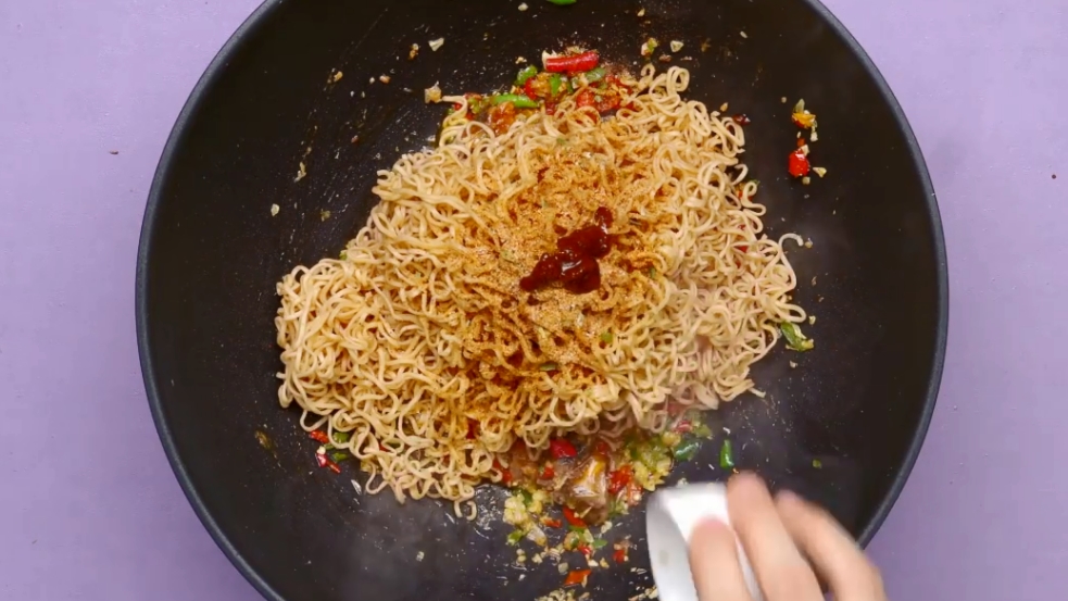 3. ใส่ปลากระป๋องลงไปผัด และตามด้วยเส้นบะหมี่กึ่งสำเร็จรูป ปรุงรสด้วยเครื่องปรุงที่ให้มาในซอง น้ำปลา น้ำตาล และซอสหอยนางรม