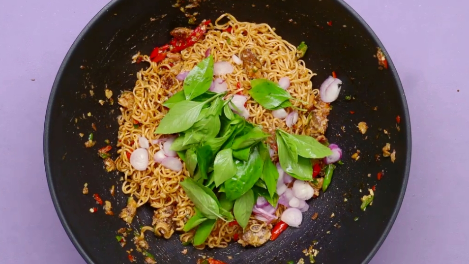 4. ใส่หอมแดงซอยและใบโหระพาลงไป ผัดให้เข้ากันอีกครั้งและตักใส่จานเสิร์ฟทันที