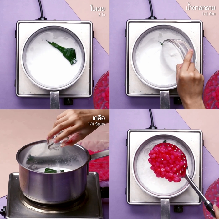 4. ตั้งน้ำกะทิด้วยไฟ่อน ใส่ใบเตยมัดปมลงไป ปรงุรสด้วยน้ำตาลทรายและเกลือ จากนั้นให้ใส่ทับทิมกรอบลงไปในน้ำกะทิ เสร็จแล้วก็ตักใส่จานเสิร์ฟได้เลยค่ะ
