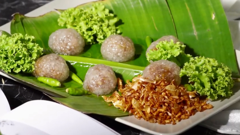 - ผสมเม็ดสาคูกับน้ำอุ่น แล้วปั้นไส้หมูให้พอดีคำแล้วห่อด้วยเม็ดสาคู