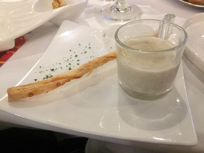 ตามมาด้วยเมนู “ซุปเห็ดทรัฟเฟิล” อุ่นๆ ที่ทั้งหอม ทั้งเข้มข้น แถมรสชาติยังกลมกล่อม ทานคู่กับขนมปังขาไก่