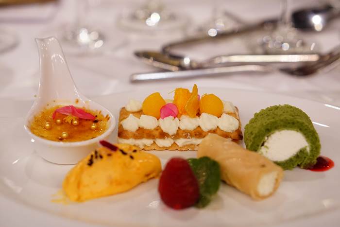 ฟินกับจานหลักกันไปแล้ว ก็มาปิดท้ายกันด้วยเมนูของหวาน “Sweet November” ที่เป็นการรวมอาหารหวานทั้งแบบไทยและฝรั่งเศสมาไว้ในจานเดียวกัน ทั้งวาฟเฟิลสลับครีม ที่มีฝอยทองและทองหยอดวางอยู่ด้านบน ,ชาเขียวโรล สอดไส้ครีมมะพร้าว, ทองม้วนสอดไส้ครีมมะพร้าว พร้อมเบรกความหวานด้วยเบอร์รี่รสเปรี้ยว ก่อนตบท้ายด้วยเครมบูเล่ทุเรียน เรียกได้ว่า ใครที่ชอบของหวานได้ฟินกับเมนูนี้อย่างแน่นอน