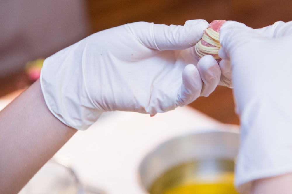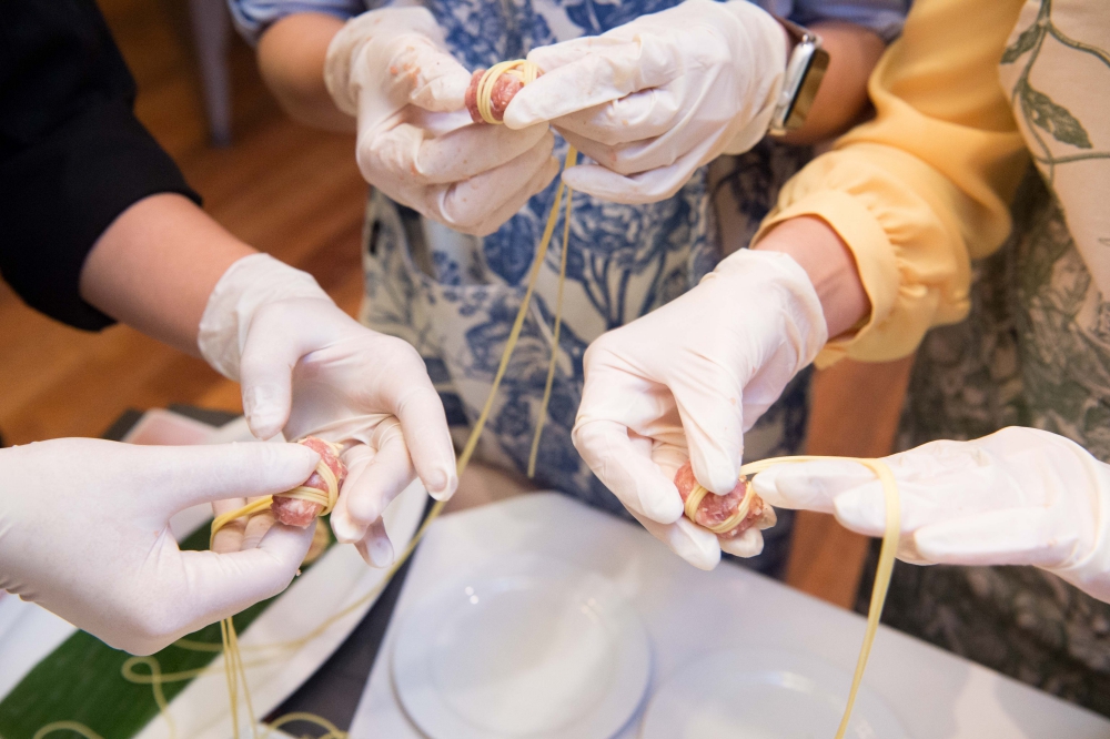 วิธีทำ : นำหมูบดและเครื่องปรุงคลุกให้เข้ากันแล้วนวดให้เหนียว นำเส้นหมี่ซั่วมาจุ่มน้ำพอชุ่ม ผึ่งไว้ในตะแกรง พร้อมคลุมผ้าขาวบาง จากนั้นจับเส้นหมี่ซั่วประมาณ 3-5 เส้น พันหมูให้เป็นก้อนกลมคล้ายลูกตะกร้อ แล้วตั้งกระทะใส่น้ำมัน ใช้ไฟอ่อนปานกลาง นำหมูที่พันเส้นหมี่ซั่วแล้วลงทอดโดยให้น้ำมันท่วมชิ้นหมู ทอดจนสุกเหลืองอร่าม นำขึ้นวางพักให้สะเด็ดน้ำมัน รับประทานคู่กับน้ำจิ้มบ๊วย