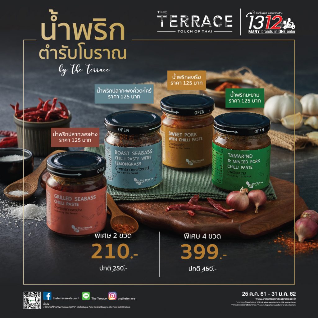 ลิ้มรสความอร่อยแบบไทยแท้ๆได้ตั้งแต่วันนี้ -31 มกราคม 2562ที่ร้านเดอะ เทอเรสในราคาเริ่มต้นเพียงขวดละ 125บาท หรือจะในราคาสุดคุ้ม **พิเศษ!! เมื่อซื้อน้ำพริกรสชาติใดก็ได้2ขวดราคา210.- (ปกติ250.-) หรือ 4 ขวดราคา399.- (ปกติ450.-)เท่านั้นสอบถามข้อมูลเพิ่มเติม CRG Call Centerโทร.02-66-33-888หรือwww.theterracerestaurant.co.thและwww.facebook.com/theterracerestaurant