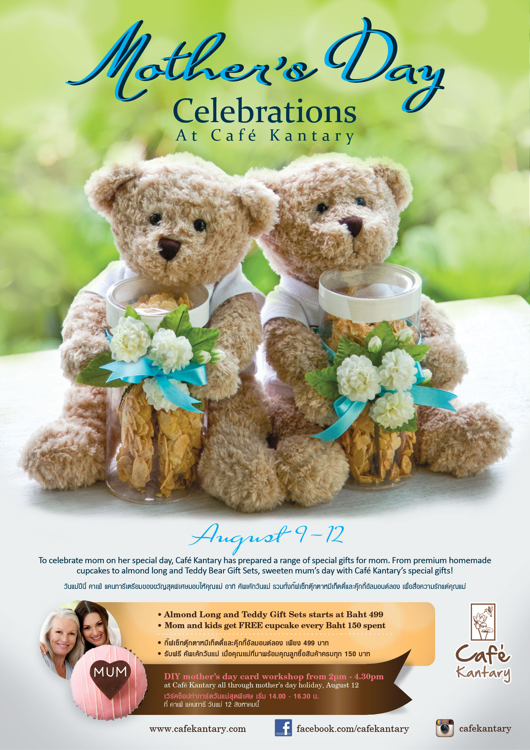วันแม่ปีนี้ คาเฟ่ แคนทารี สาขาอยุธยาระยอง เชียงใหม่ และศรีราชาได้เตรียมของขวัญสุดพิเศษกิ๊ฟเซ็ตตุ๊กตาหมี เท็ดดี้และคุกกี้อัลมอนด์ลองราคาเพียง?499 บาท และสำหรับหนูๆที่พาคุณแม่มาทานเค้กทุกๆ150?บาทรับฟรี?คัพเคกวันแม่แสนอร่อย พร้อมกิจกรรมพิเศษเวิร์คช็อบประดิษฐ์การ์ดให้คุณแม่ฟรี