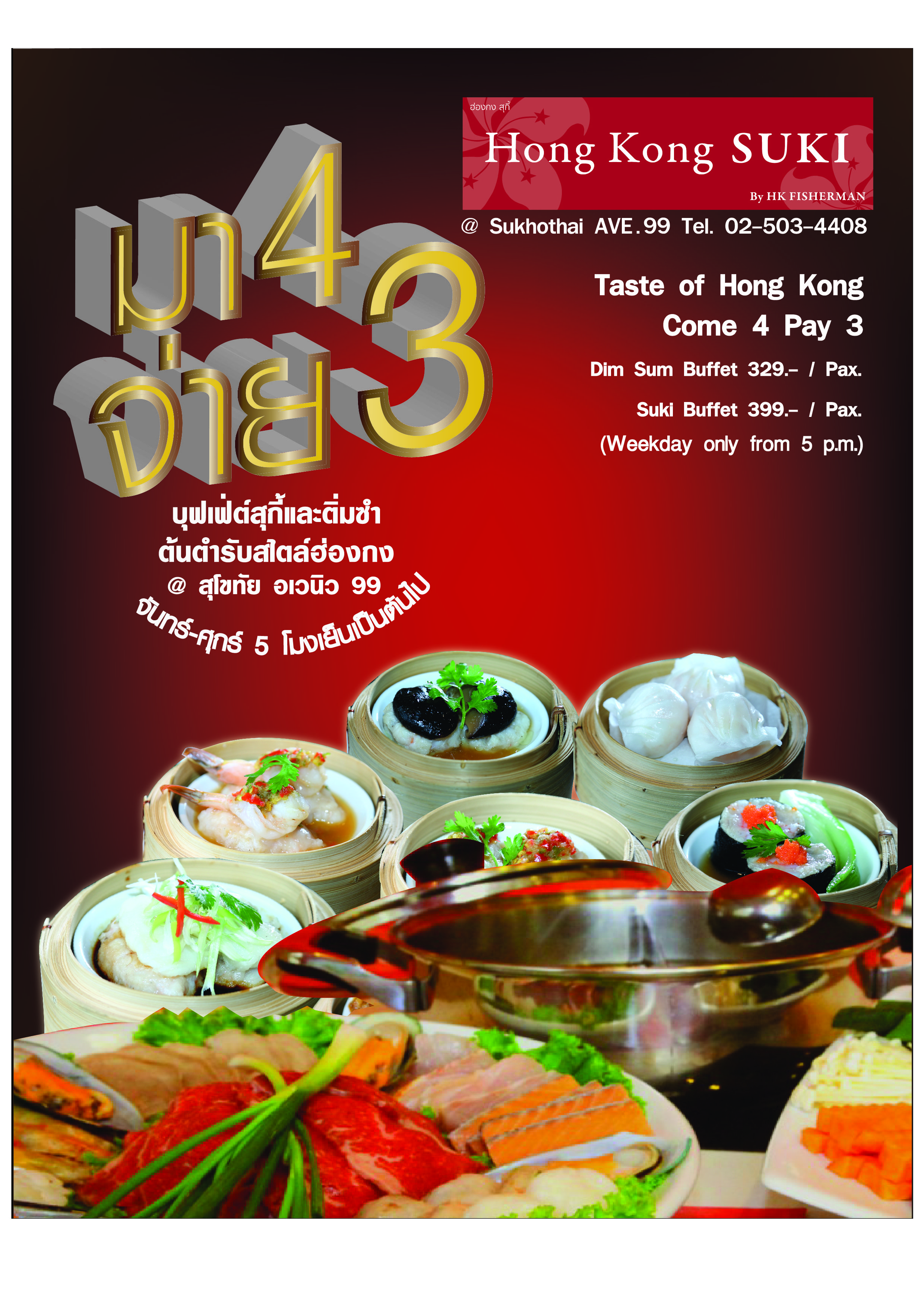 ต้อนรับเทศกาลปีใหม่และทุกมื้อพิเศษ ในวันจันทร์ถึงศุกร์ตั้งแต่ห้าโมงเย็นเป็นต้นไป เต็มอิ่มกับสุกี้บุฟเฟต์สไตล์ฮ่องกงพร้อม3น้ำซุปแบบไม่ซ้ำใคร อาทิ ซุปยาจีน,เสฉวน และไข่เยี่ยวม้ารากผักชี