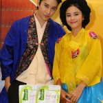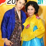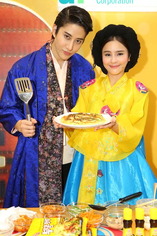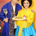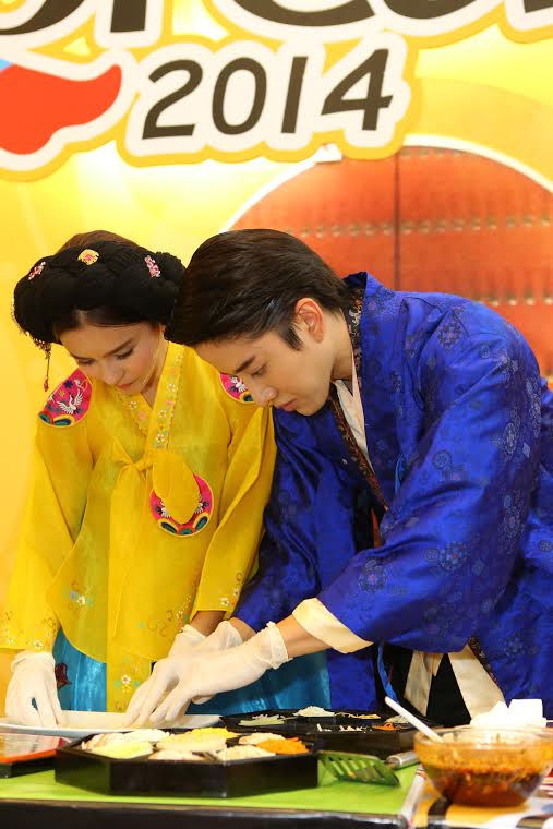 ไมค์-ออม จัดเต็มในชุดฮันบก เพื่อปรุงอาหารเกาหลีโชว์ สวยหล่อเหมือนหลุดออกมาจากห้องเครื่องในราชสำนัก งานนี้ได้ เชฟมิสคิม ฮันนา จากภัตตาคารอาหารคองจู มาสอนวิธีทำอยู่ใกล้ๆ เริ่มด้วย 2 เมนูเด็ด เริ่มด้วย พิซซ่าเกาหลี หรือ พาจอน เมนูนี้สาวออมอาสาหยอดแป้งสไตล์เกาหลีที่มีส่วนผสมของกุ้ง หอย ปลาหมึก ลงในกระทะ ท่าทางอาจจะดูเก้ๆ กังๆ ไปบ้าง แต่ก็ได้หนุ่มไมค์คอยเป็นลูกมือช่วยตอกไข่ ตีไข่และโรยต้นหอมอยู่ข้างๆ ไม่ห่าง จนได้พิซซ่าเกาหลีแบบหอมฉุยไปทั่วทั้งงาน ตามด้วยเมนูพิเศษ กู จอล พัน หรือเมนูเจ้าหญิงนพเก้า อาหารตำรับราชวงศ์เกาหลี ประกอบไปด้วยอาหาร 9 ชนิด ได้แก่ แป้งแผ่นกลม เห็ดเข็มทอง แครอท แตงกวาคว้านไส้ซอยเป็นเส้นยาวๆ กุ้งต้ม ไก่ต้ม แฮมหรือปูอัดหั่นฝอยหรือฉีกยาว ไข่ขาวและไข่แดงหั่นฝอย ใส่เรียงในถาดที่แบ่งเป็นช่องๆ ซึ่งงานนี้เชฟคิมได้จัดเตรียมไว้เรียบร้อยแล้ว ไมค์-ออม เลยช่วยกันใส่เครื่องเคียงทั้งหมดลงในแผ่นแป้งแบบตั้งใจสุดๆ ก่อนจะราดด้วยน้ำจิ้มสูตรพิเศษ แล้วห่อเป็นคำรับประทาน ไมค์-ออม บอกว่า “จริงๆ แล้วไม่ถนัดทำอาหารเท่าไหร่ โดยเฉพาะอาหารเกาหลีที่มีวิธีการทำที่ยุ่งยาก เครื่องปรุงมากมาย เลยถนัดกินมากกว่า พอวันนี้ได้ลองทำดูแล้วก็ไม่ได้ยากอย่างที่คิด เชฟคิมบอกถ้าอยากทำให้อร่อยว่า แค่รักและใส่ใจในการทำมากๆ ก็พอ”