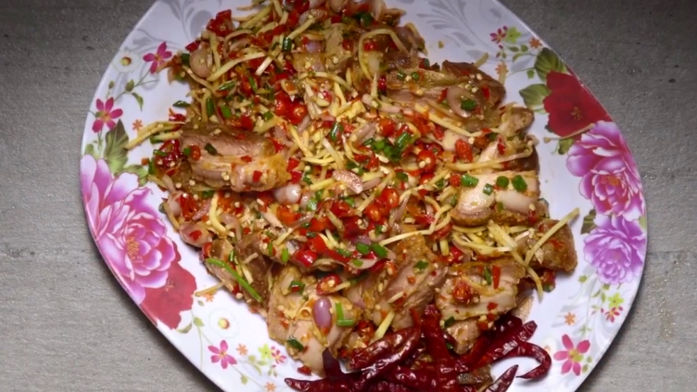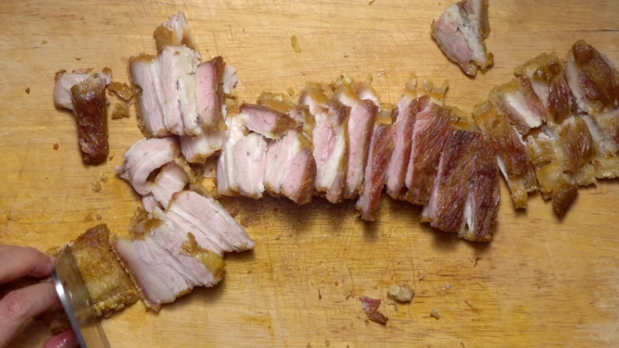 1. หั่นหมูกรอบให้เป็นชิ้นพอดีคำ เตรียมไว้