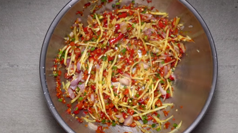 2. ปรุงรสน้ำยำด้วย มะนาว น้ำปลา น้ำตาลทราย พริกขี้หนูซอย หอมแดง ขิงซอย ต้นหอมซอย และ พริกขี้หนูสับ