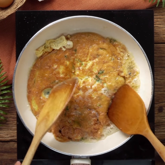 - เทไข่ที่ตีไว้ลงไป ทอดกลับกัน