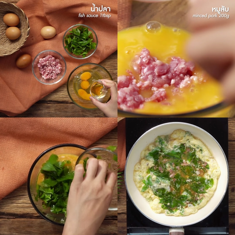 - ตีไข่ ปรุงรสด้วยน้ำปลา ใส่หมูสับและผักหวาน