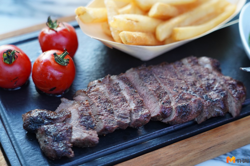ส่วนแนวพรีเมียมก็มี เริ่มที่จานนี้ Steak & Fries: grain-fed sirloin, salsa verde (850.-) สเต็กเนื้อเซอร์ลอยน์ซอสซัลซ่าเวอร์เดฉ่ำๆ