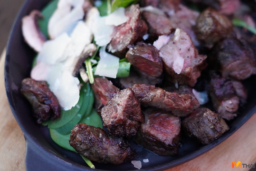 BBQ Wagyu beef finger ribs, mushroom spinach salad (850.-) เนื้อวากิวร่องซี่โครงย่าง ไม่ต้องจิ้มอะไรมาก แค่บีบเลมอน เกลือ พริกไทย ก็ฟินซู้ดดดด