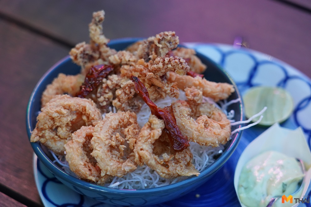 จานต่อมาเป็น Crispy calamari, avocado chili mayo (350.-) ปลาหมึกชุบเกล็ดขนมปังทอดกรอบ เสิร์ฟพร้อมดิปอะโวคาโดซอส