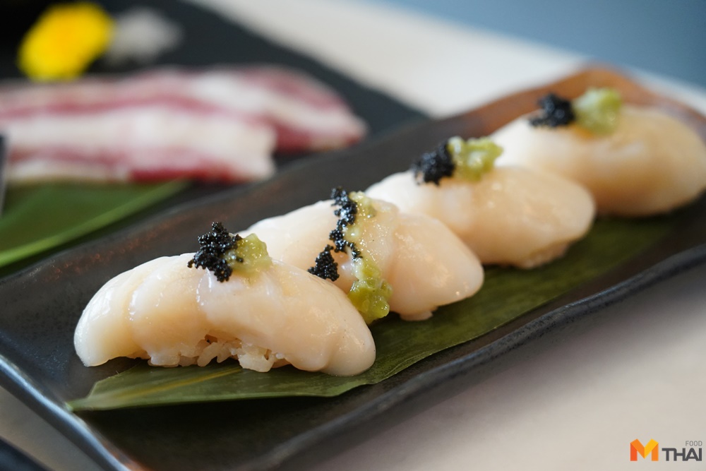 ส่วนจานนี้ Wagyu Hoba Yaki เนื้อสไลด์โรยไข่ปลาย่างวางบนใบโอบะได้กลิ่นหอมๆเนื้อยังคงฉ่ำละลายในปากดีมากๆ เนื้อแกะพรีเมียมก็มี ซีฟู้ดก็มาทั้งหอยโฮตาเตะตัวโตเด้งๆย่างเนยและกระเทียมชีส Korean Oyster หอมนางรมเกาหลีใซอสโชยุ Argentine Red Shrimp กุ้งอาเจนติน่าสีแดงสดๆ Zuwai Kani Miso มันปูซูไวย่างหวานมัน ต้องเบิ้ลเลยนอกจากของย่างยังมีซาชิมิ ซูชิให้อิ่มกันอีก ทั้งซูชิโฮตาเตะซูชิท้องปลาแซลมอนท็อปเห็ดทรัฟเฟิล ซูชิกุ้งอากาเอบิโรยไข่แซลมอนซูชิปลาไหลอานาโกะ กุ้งแดงซอสเมนไตโกะเบิร์นไฟส่วนอันนี้ชอบสุด ซูชิฟัวกราส์ ซูชิเอนงาวะโรยไข่กุ้ง เอ็นงาวะเมนไตโกะโรล