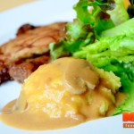หมูพริกไทยดำ + มันบด (89+20 บาท) จานนี้เลือกเครื่องเคียงเป็นมันบดคิดเพิ่ม 20 บาท เป็นเนื้อหมูหมักกับพริกไทยดำ สูตรของทางร้าน เนื้อหมูจะนุ่มๆ มีรสชาติเผ็ดของพริกไทยดำเล็กน้อย เมื่อได้ทานคู่กับมันบด ก็ทำให้ลงตัวไปอีกขั้น