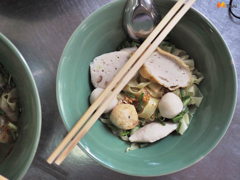 ลูกชิ้นปลาทำเองไม่ต้องพูดถึงมาตรฐานอยู่แล้วครบถ้วน ทั้ง กรอบ เด้งดี เคี้ยวสนุก ทีเด็ดที่ขอพูดคือบะหมี่เป๊าะเส้นใหญ่เหนียวนุ่มเคี้ยวกรุบๆ คำว่าใหญ่ในที่นี้คือบะหมี่ไข่เหลืองเส้นแบนที่เกือบจะใหญ่เท่าเส้นใหญ่อยู่แล้ว ความเด็ดคือเวลาเราปรุงต้มยำเนี่ย ทั้งถั่วพริกคั่วน้ำมันกระเทียมเจียวและซอสเปรี้ยวแบบจีนจะผสมผสานกันลงตัวและเกาะเคลือบอยู่ที่เส้น เวลาเคี้ยวเนี่ย โอ้ย!! คือไม่ต้องพูดอะไรต่อเลยไปกินเถอะ