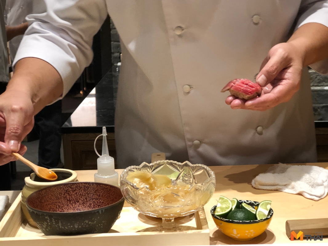 ซูชิคำนี้เสิร์ฟมากับปลาทูน่าที่ใช้ส่วนของอากามิ (Akami) เป็นส่วนของเนื้อปลาที่ไม่มีไขมัน และชูโทโร่ (Chutoro) เป็นส่วนของเนื้อปลาที่มีไขมันปานกลางสลับกับชั้นเนื้อปลา ซึ่งเชฟนำไปย่างไฟกำลังพอดีคำ หอมกลิ่นฟางไฟทานพร้อมกับวาซาบิสด อร่อยนุ่มชุ่มลิ้นมากๆ
