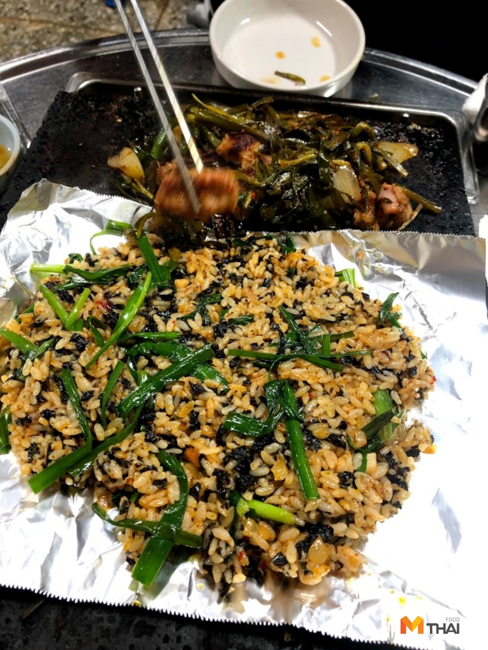 และเมื่อทานไส้ย่างหมดแล้ว พนักงานจะนำข้าวมาผัดลงบนฟอยล์ คลุกเคล้ากับผักและสาหร่ายตบท้าย ซึ่งเป็นสไตล์เกาหลีที่มักจะนำข้าวมาผัดปิดท้าย แต่ต้องบอกว่าอร่อยสมใจจริงๆ